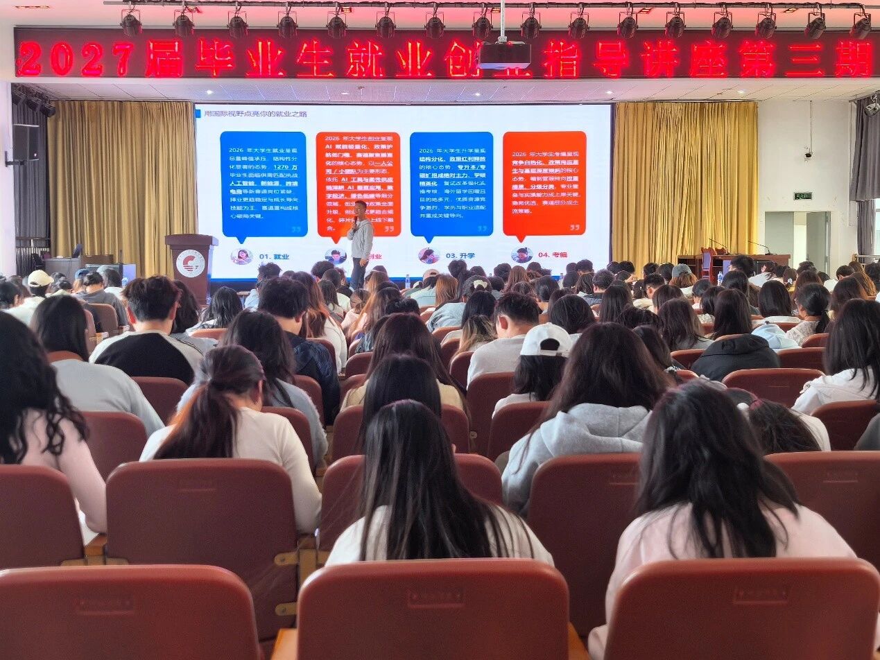 为帮助2024级学子明晰就业方向、把握数字经济与跨境电商发展机遇,2026年3月25日下午,商务信息学院在经开校区图科楼305报告厅举办“用国际视野点亮你的就业之路——站在云端看择业”专题讲座。学院全体教职工及2024级各专业学生到场参加,讲座由商务信息学院副院长李忠岘老师主持。