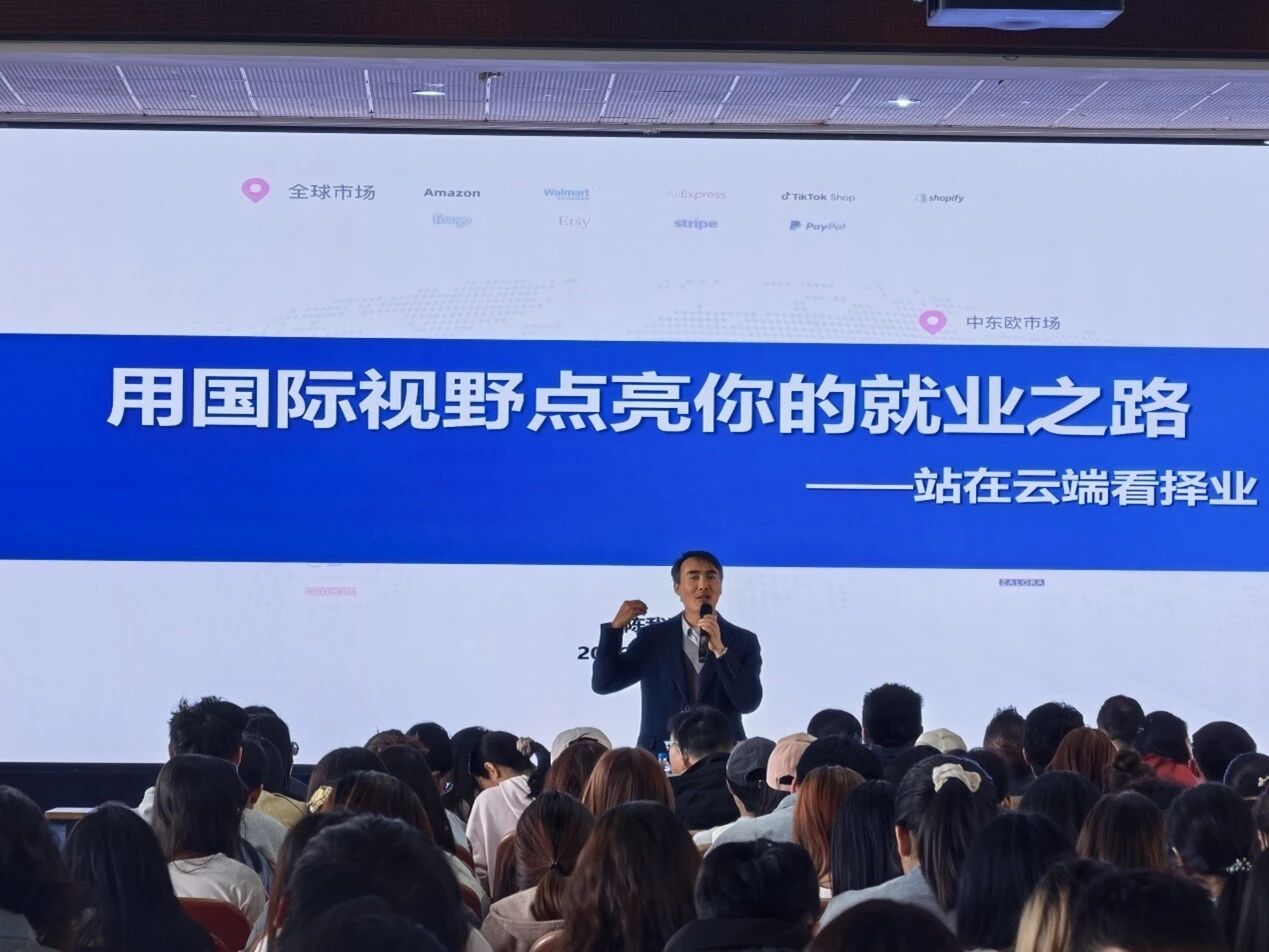 本次讲座特邀友鱼互联网产业(云南)有限公司、阿里巴巴1688国际站经理陈我磊主讲。陈老师结合自身跨境电商与国内电商实战经验,从全球经济变革、AI时代就业趋势、消费市场迭代、大学生择业创业四大维度,用真实数据与行业案例,为师生带来接地气、可落地的就业指导。