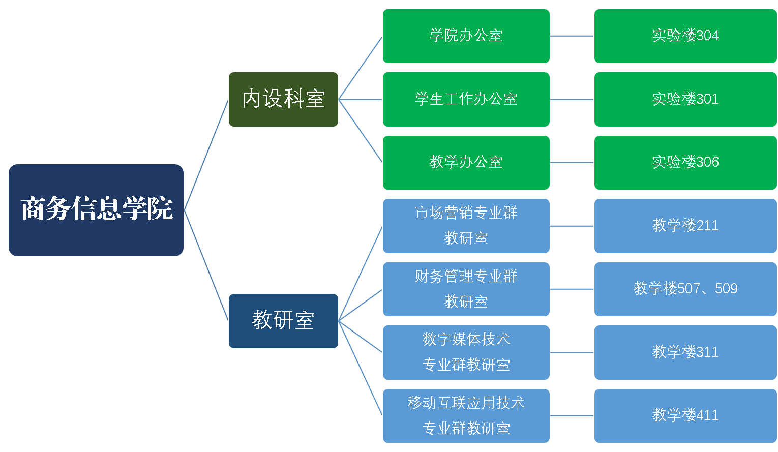 商务信息学院目前设置有学院办公室、学生工作办公室、教学办公室